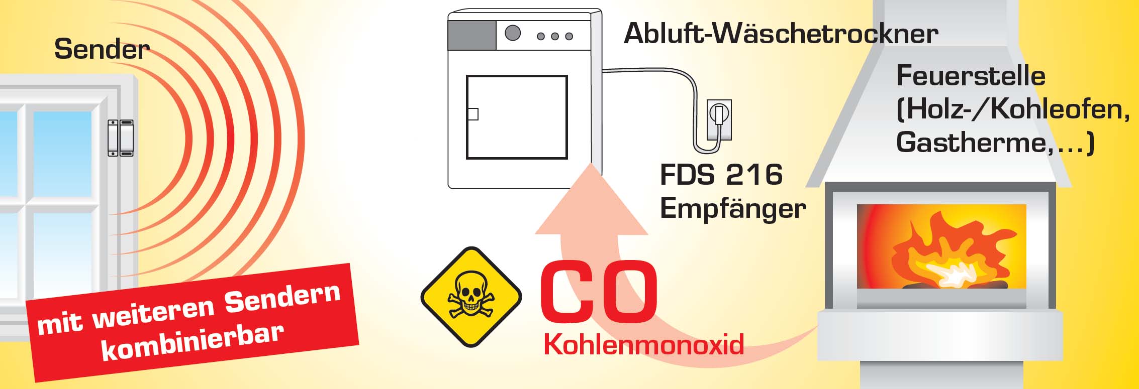 Das FDS 216 Set sorgt für einen sicheren Betrieb von Abluftanlagen, indem es die Fensterstellung überwacht und die Information per Funk an den Einbau-Empfänger überträgt. Der Sender am Fenster erkennt zuverlässig, ob das Fenster gekippt oder geöffnet ist. Nur bei geöffnetem Fenster kann frische Zuluft einströmen und gefährlicher Unterdruck vermieden werden, der giftiges Kohlenmonoxid aus Verbrennungsstätten in den Raum ziehen könnte.