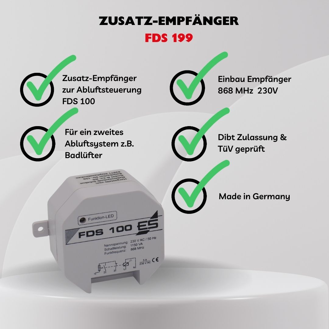 Zum bestehenden Set FDS 100 oder FDS 200 kann ein weiterer Einbau-Empfänger FDS 199 angesteuert werden. Sobald das Fenster geöffnet wird, werden über die beiden Empfänger zwei Abluftsysteme freigeschalten.