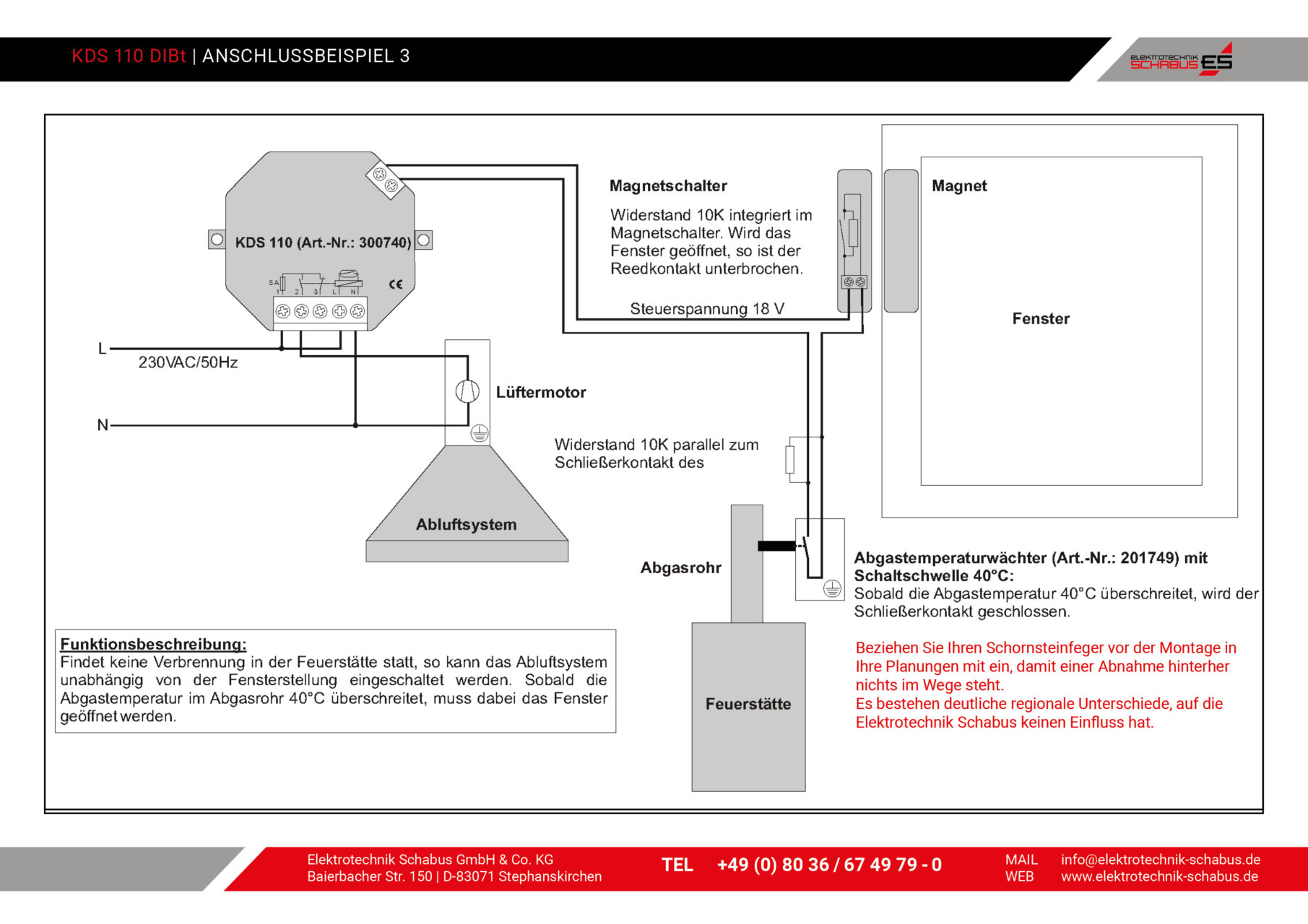 KDS 110 kombiniert mit Abgastemperaturwächter ATW-519: Sobald die Abgastemperatur im Abgasrohr 40 °C überschreitet, muss das Fenster geöffnet werden.