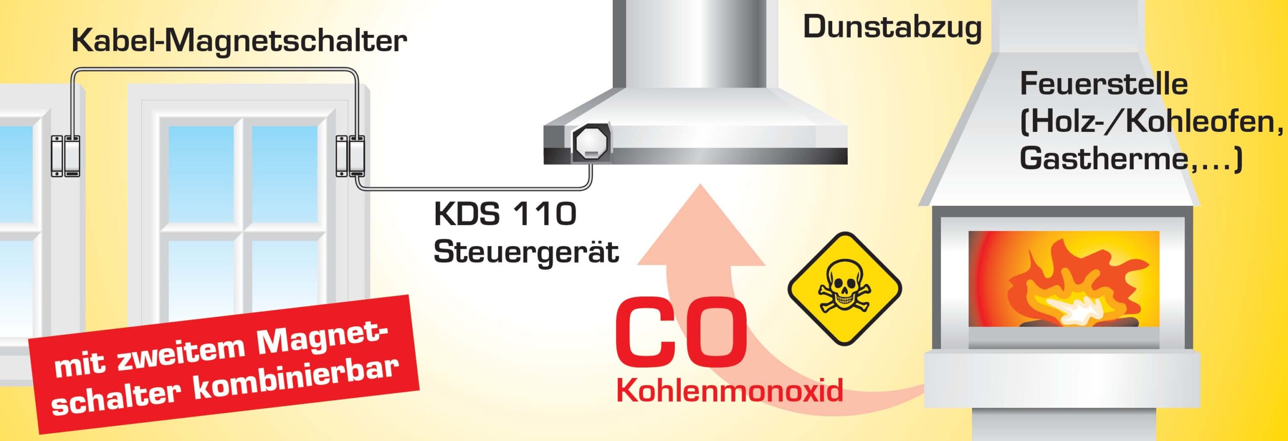 Die KDS 116 Kabelabluft-Steuerung sorgt für einen sicheren Betrieb von Abluftanlagen, indem es die Fensterstellung überwacht und die Information über die Steuerleitung an den Einbau-Empfänger überträgt. Der Magnetschalter am Fenster erkennt zuverlässig, ob das Fenster gekippt oder geöffnet ist. Nur bei geöffnetem Fenster kann frische Zuluft einströmen und gefährlicher Unterdruck vermieden werden, der giftiges Kohlenmonoxid aus Verbrennungsstätten in den Raum ziehen könnte.