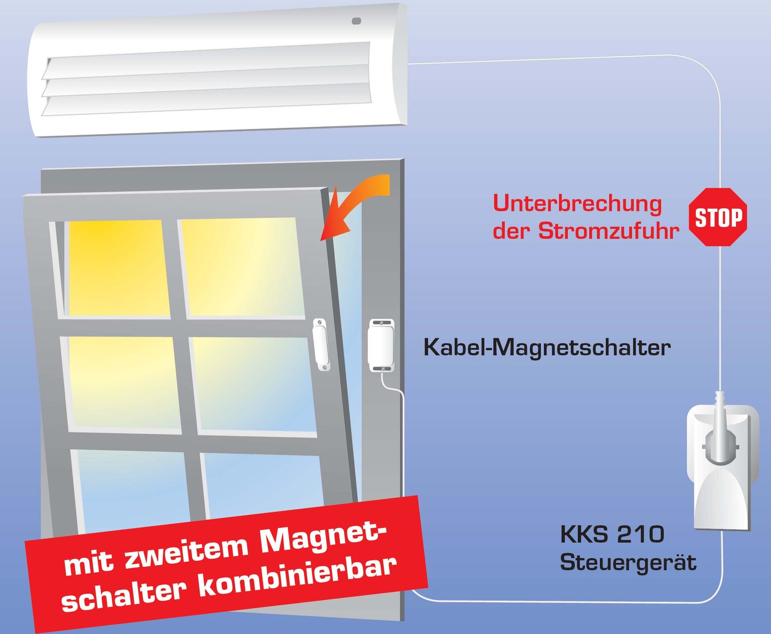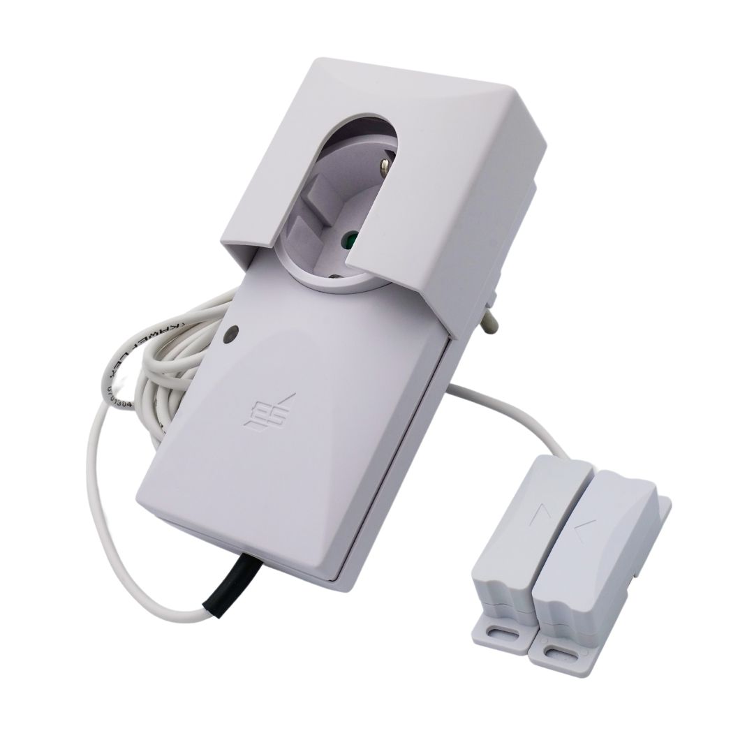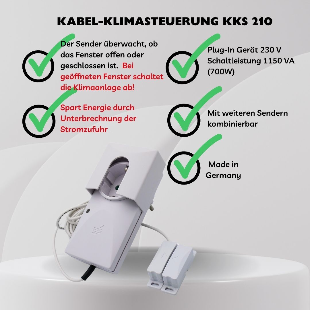 Der Sender am Fensterflügel überwacht die Fensterstellung und übermittelt die Information per Funk an einen Empfänger mit potentialfreiem 5-A-Wechselrelais, dieser wird einfach zwischen Steckdose und Netzstecker der Klimaanlage gesteckt. So kann eine Klimaanlage bei gekipptem oder geöffnetem Fenster automatisch ausgeschaltet werden, damit nicht die Außenluft gekühlt und damit unnötig Energie verschwendet wird. Die Netzstecker-Sicherung verhindert das Umstecken des Gerätesteckers der Klimaanlage.