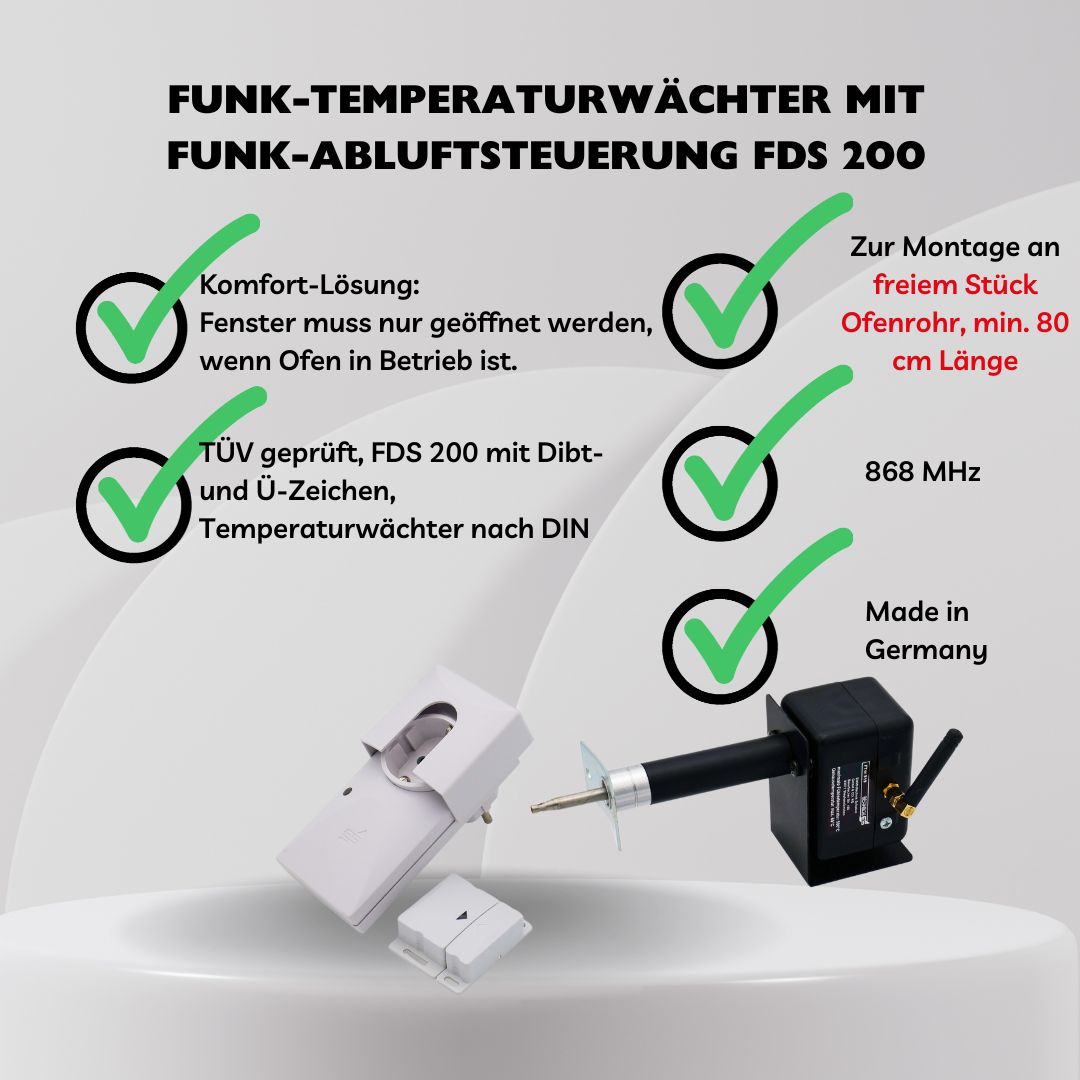 Das Set aus FTW 519 Funk-Temperaturwächter und Fenstersender eignet sich perfekt für Einzelöfen, bei denen eine Abluftsteuerung vorgeschrieben oder empfohlen ist. Das System sorgt dafür, dass Ihre Dunstabzugshaube, Lüftungsanlage oder Abluftmotor nur bei sicheren Bedingungen freigegeben wird – entweder bei kaltem Ofen oder bei geöffnetem Fenster.