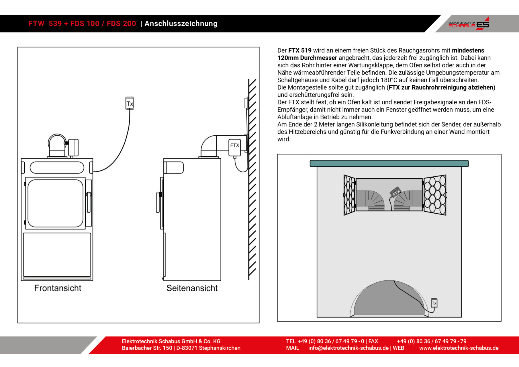 • Beziehen Sie Ihren Schornsteinfeger vor der Montage in Ihre Planungen mit ein, damit hinterher einer Abnahme nichts im Wege steht. Es bestehen deutliche regionale Unterschiede, auf die Elektrotechnik Schabus keinen Einfluss hat.