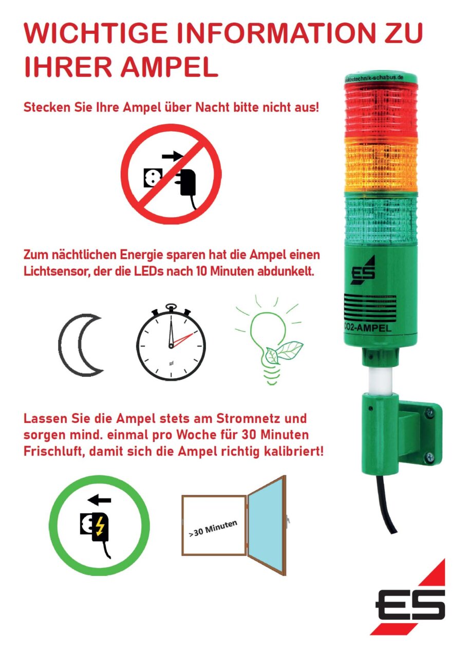 Die CO2-Ampel „school“ gibt es nicht nur in grün, sondern auch in weiß oder grau – oder auf Wunsch in der RAL-Farbe lackiert. Der beiliegende Wandhalter wird möglichst weit vom nächsten Fenster / Türe entfernt in 1,8 – 2 Meter Höhe an eine Wand montiert und das Netzteil mit seiner 2,3 Meter langen Zuleitung in eine Steckdose gesteckt. Nach drei Minuten Aufwärmphase ist die CO2-Ampel „school“ betriebsbereit. Zusätzlich kann man eine Diebstahlsicherung, ein Ballschutzgitter oder einen Standfuß bestellen. Sobald die CO2-Ampel „school“ gelb leuchtet (ab 1000 ppm) öffnen Sie ein Fenster und lüften so lange, bis die Ampel wieder grün leuchtet. Oft wird nämlich zu kurz, zu lang oder zu oft gelüftet, was unnötige Heiz- oder Klimakosten verursacht. Nachts dunkeln die LED-Leuchten automatisch ab, darum ist die CO2-Ampel „school“ besonders energiesparend.