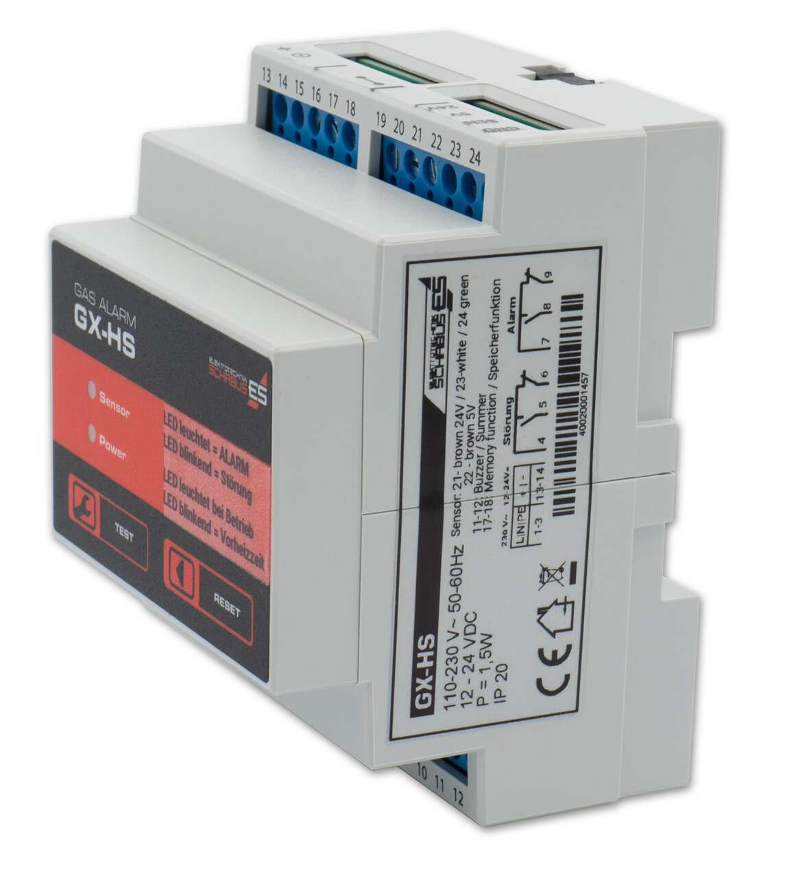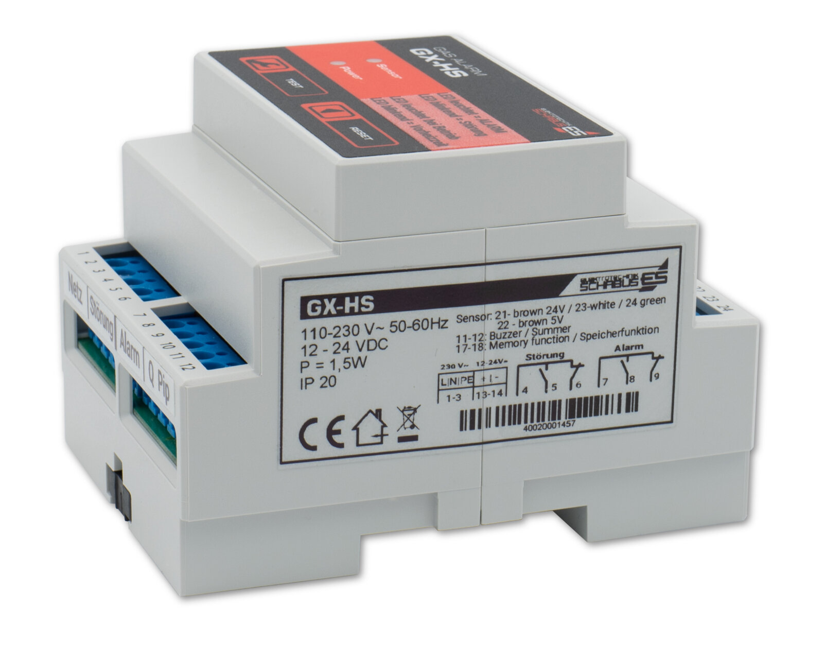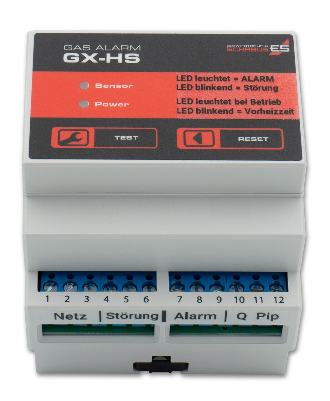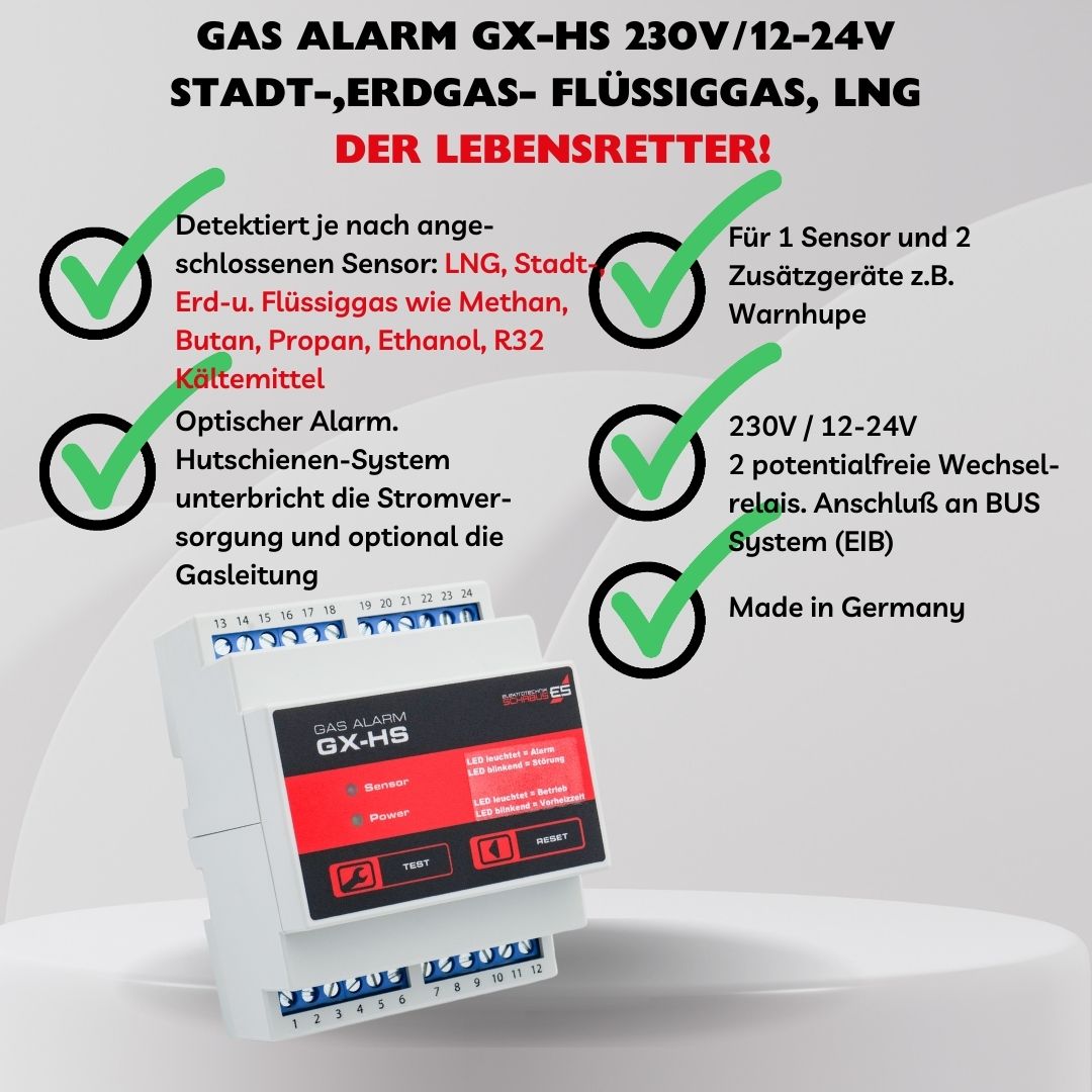 Der Gas Alarm GX-HS ist ein Gasmelder für verschiedene Gase und warnt bereits bei einer Gaskonzentration, die weit unter dem lebensbedrohlichen Wert liegt. Dieses Überwachungssystem ist deshalb seinem Zweck entsprechend sehr empfindlich eingestellt. Zu jedem Gastyp muss ein geeigneter Sensor verwendet werden. (Angaben zur Auslösung und Mindestkonzentration finden Sie jeweils in der Gebrauchsanleitung des Sensors). Das Alarmsignal erfolgt am Gerät optisch und akustisch (optional kann ein externer Summer/Piezo-Alarmgeber am Gerät angeschlossen werden). Zusätzlich wird ein potentialfreies Relais geschalten, um z.B mit dem Relais ein Magnetabsperrventil (Gaszuleitung verriegeln) zu schalten, so dass an einem eventuellen Leck in der Gasleitung oder in der Gastherme kein weiteres Gas mehr austreten kann und mit einem zweiten Relais / Störungsrelais einen Schalteingang in der Gebäudeleittechnik zu bedienen.