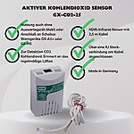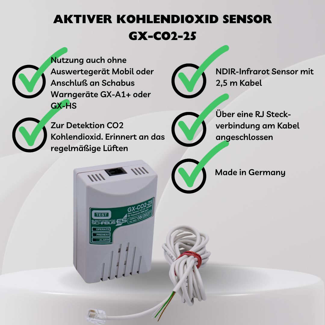Externer, aktiver CO2-Sensor mit eigener Alarmierung, LEDs und Test-Taster, zum Anschluss an die Warngeräte GX-A1+ oder GX-HS, detektiert CO2 aus verbrauchter Luft bzw. von Menschen ausgeatmetes CO2, als rechtzeitige Erinnerung zum Lüften bei etwa der halben MAK (2500 ppm). Oder als aktiver Sensor / Gasmelder zum alleinigen Betrieb mit Steckernetzteil 5V / min. 300mA, mit LED-Anzeigen für Betrieb, Störung, Alarm direkt am Sensor, sowie integrierter Testknopf zur manuellen Alarmauslösung.