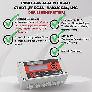 Wichtig: Der GX-CO2-30 erfüllt wesentliche Anforderungen der Technischen Regeln für Gefahrstoffe (TRGS) in Getränkeschankanlagen, ist jedoch nicht als vollständiger Ersatz eines TRGS-konformen Systems zertifiziert. Er bietet dafür maximale Kompatibilität zu den bewährten SCHABUS-Systemen und eignet sich hervorragend als praxisnahes Warnsystem für Gastronomie, Lebensmittelverarbeitung und technische Betriebsräume mit CO₂-Anwendungen.