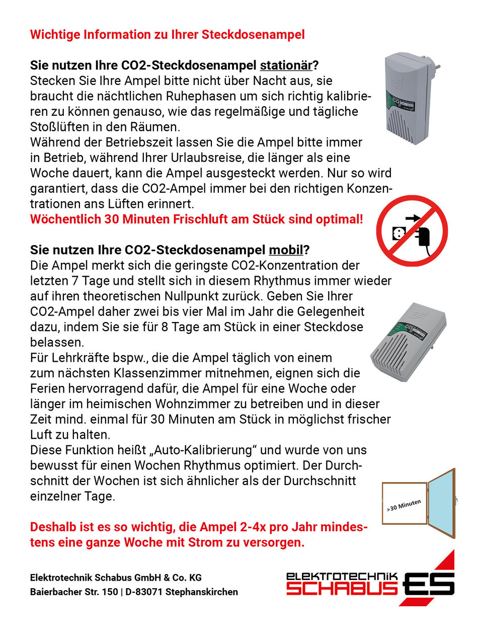 Während der Betriebszeit lassen Sie die Ampel bitte immer in Betrieb, während Ihrer Urlaubsreise, die länger als eine Woche dauert, kann die Ampel ausgesteckt werden. Nur so wird garantiert, dass die CO2-Ampel immer bei den richtigen Konzentrationen ans Lüften erinnert.