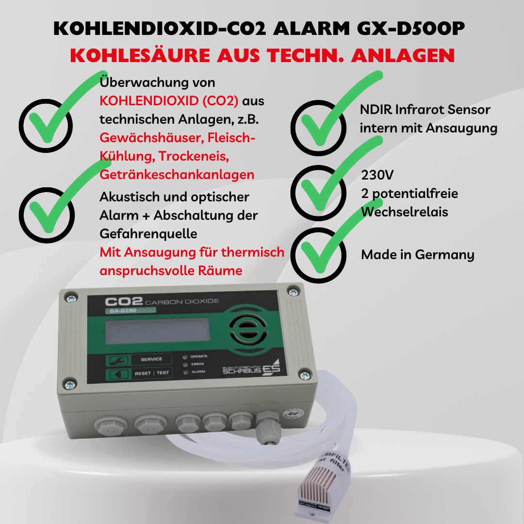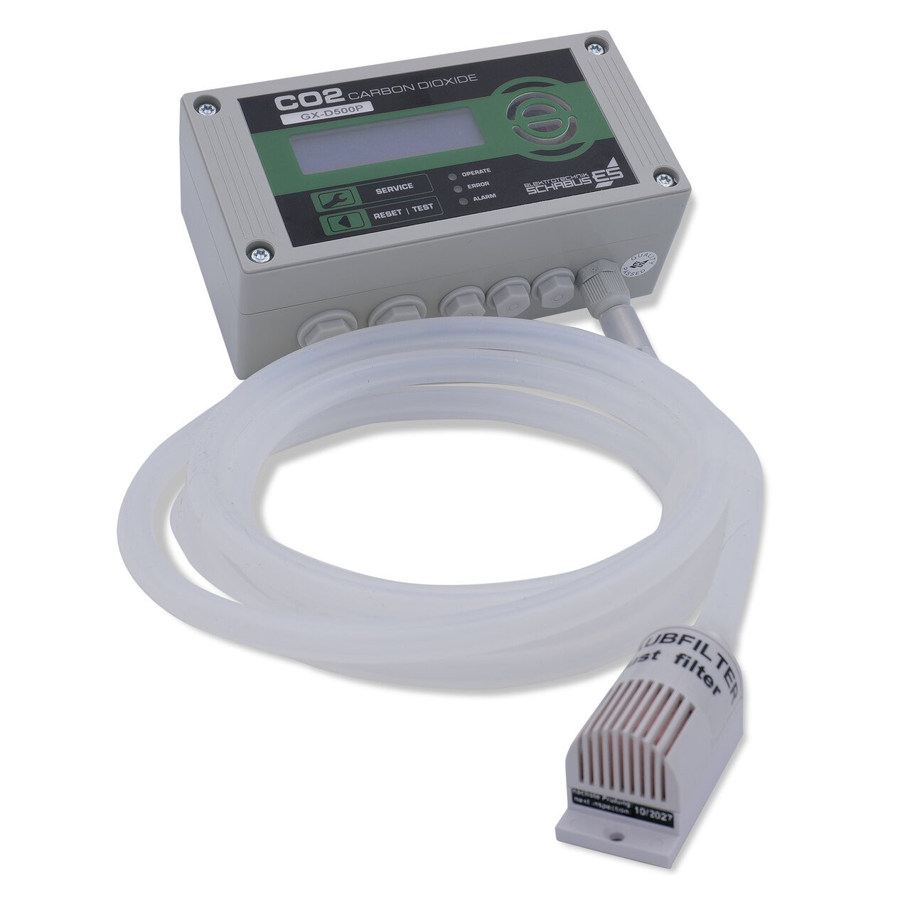 Der CO2-Warnmelder GX-D500P ist ein prof. Warngerät mit fest eingestellten Alarmschwellen bei 1,5% CO2 für Voralarm und 3,0% CO2 für Hauptalarm. Der Einsatzzweck ist vielseitig, es kann auch Luft in thermisch anspruchsvoller Umgebung überwacht werden. Seien es besonders kalte Räume wie Kühlungen mit Getränkeschankanlagen und Trockeneislager für Impfzentren oder besonders warme und heiße Räume. Möglich macht das ein Ansaugsystem, das den zu überwachenden Raum mit einem dickwandigen Silikonschlauch erweitert und verbindet.