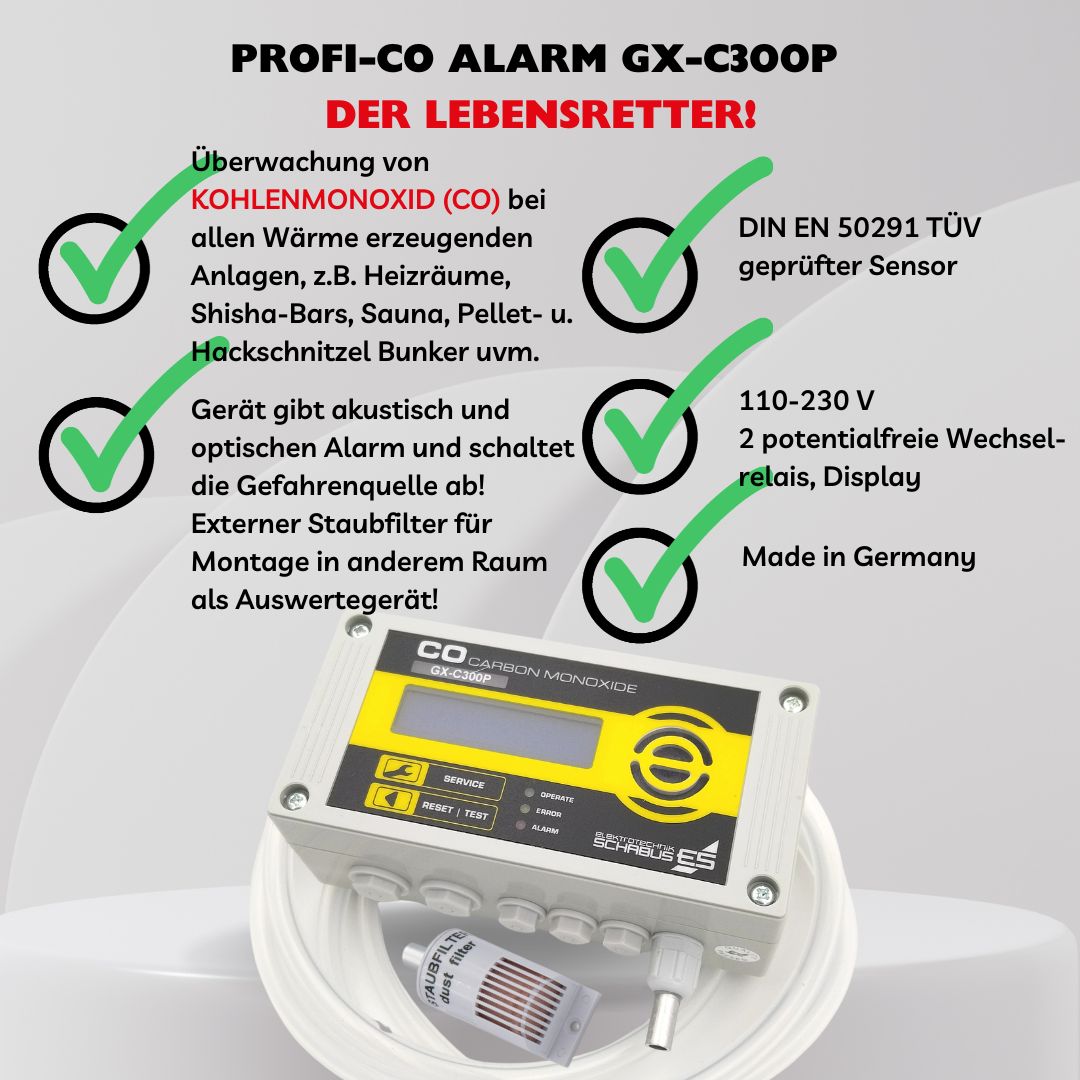 Der GX-C300P ist ein professionelles Kohlenmonoxid-Warngerät zur Festinstallation, das speziell für anspruchsvolle Umgebungen wie gasbetriebene Saunen, Kühlhäuser oder staubbelastete Räume – etwa Pellet- und Hackschnitzelbunker – entwickelt wurde. Dank seines integrierten Unterdrucksystems kann die zu überwachende Luft über einen fest installierten Silikonschlauch zuverlässig zur Messzelle geleitet werden. Dies ermöglicht eine präzise Überwachung auch in Bereichen, in denen elektrische Installationen nicht möglich oder sinnvoll sind. Das Gerät misst die CO-Konzentration exakt und zeigt den Wert in ppm auf einem beleuchteten Klartext-Display an. Bereits nach maximal 30 Sekunden liefert das System verlässliche Messergebnisse.