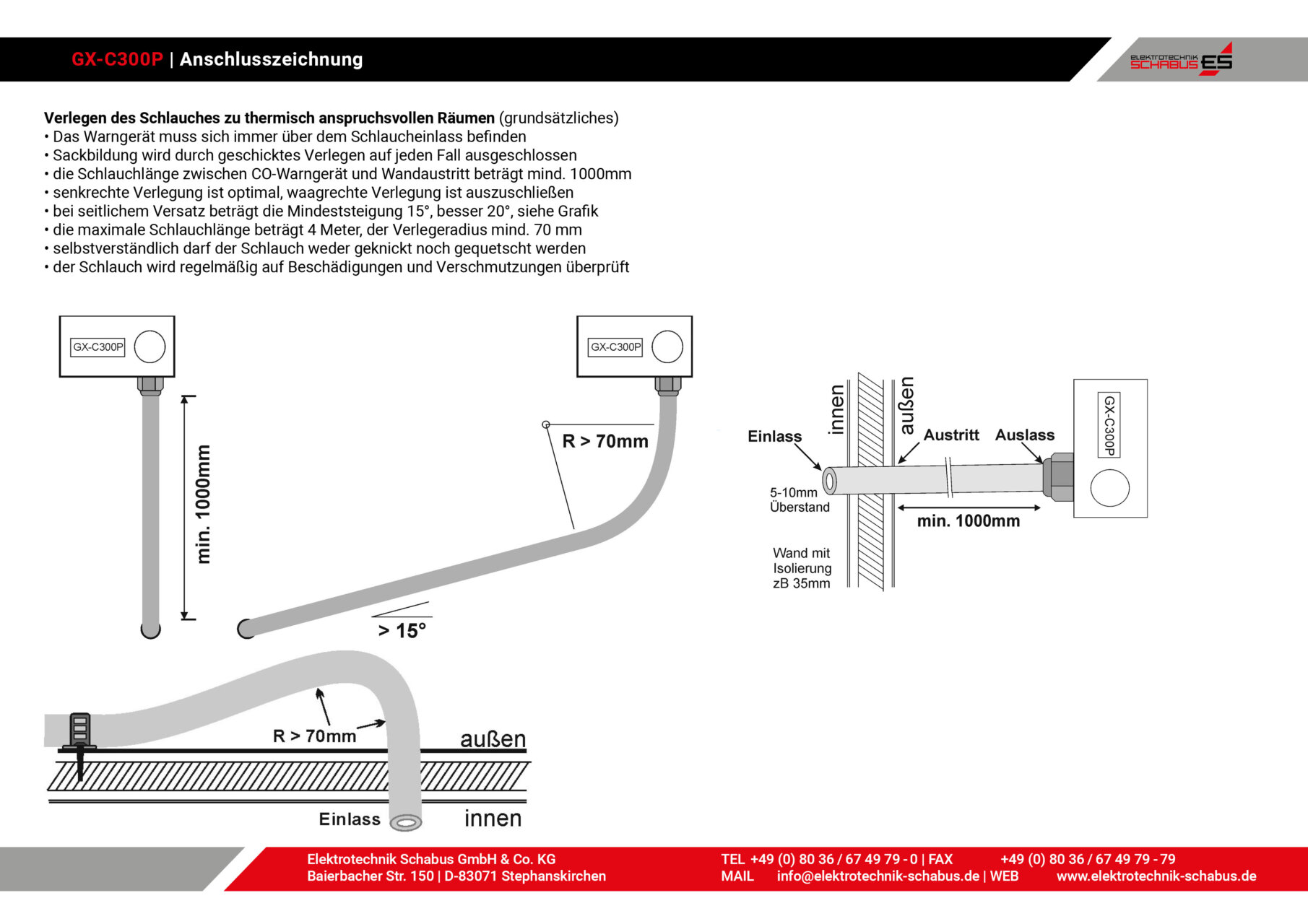 Da der GX-C300P häufig in industriellen oder spezialisierten Umgebungen eingesetzt wird, können die werkseitig festgelegten Alarmstufen und Verzögerungszeiten auf Wunsch individuell angepasst werden. Während die Standardwerte optimal auf Wohnräume oder wohnungsähnliche Bereiche ausgelegt sind, haben viele Anwender eigene Anforderungen an das CO-Warnsystem. Elektrotechnik Schabus bietet daher einen umfassenden Programmier-Service an, bei dem das Gerät exakt auf die gewünschten Parameter abgestimmt wird. Kunden erhalten hierzu eine ausführliche Beratung sowie einen Test- und Prüfbericht, der die angepassten Einstellungen dokumentiert. Diese Möglichkeit der Individualisierung steht auch für alle weiteren Schabus C300-Warngeräte zur Verfügung.