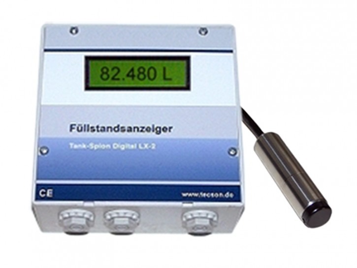 Der elektronische Tankinhaltsanzeiger ist einsetzbar zur Überwachung von Behälterinhalten in drucklos betriebenen Flüssigkeitsbehältern. Das Gerät besteht aus einer hydrostatischen Messsonde für den Füllstand, kombiniert mit einem digitalen Anzeigegerät. Die Leitungsverbindung zwischen Messsonde und Anzeigegerät kann im Normalfall auf gut 100 m verlängert werden. Das Gerät wird bei der Installation über drei Bedientasten einmalig eingestellt. Je nach Höhe des Tanks können unterschiedliche Messbereiche für die Pegelsonde geliefert werden, z.B.: 0 – 200 mbar : f. Heizöl/Dieseltanks bis 2,40 / 2,50 m bzw. 2 m WS 0 – 250 mbar : f. Öltanks bis 3,00 m bzw. Wassersäule 2,50 m 0 – 500 mbar : f. Öltanks bis 6,00 m bzw. Wassersäule 5,00 m Sondentyp bitte bei Bestellung angeben!