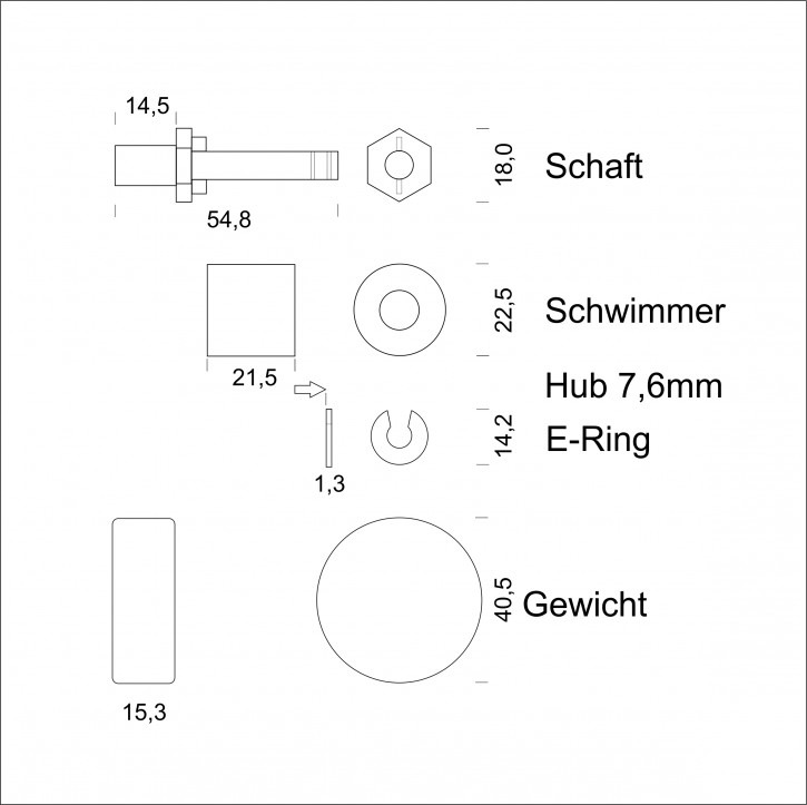 Anschluss Gewinde PP, Schaft PP, ø8,3 mm, 58 mm lang, Schwimmer PP ø23 mm