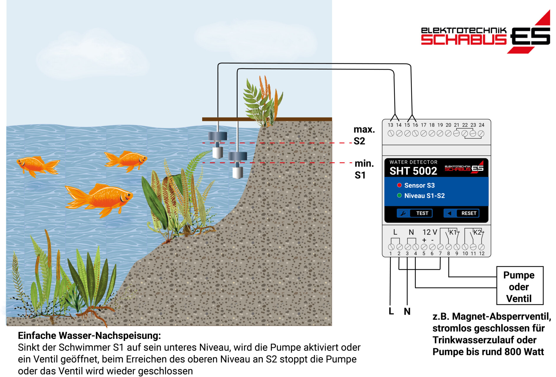 Sinkt der erste Schwimmerschalter (S1) auf sein unteres Niveau, wird über den angeschlossenen Wassermelder eine Pumpe aktiviert oder ein Magnetventil geöffnet. Steigt der Wasserstand anschließend wieder an und erreicht den zweiten Schwimmerschalter (S2), wird die Nachspeisung automatisch gestoppt.