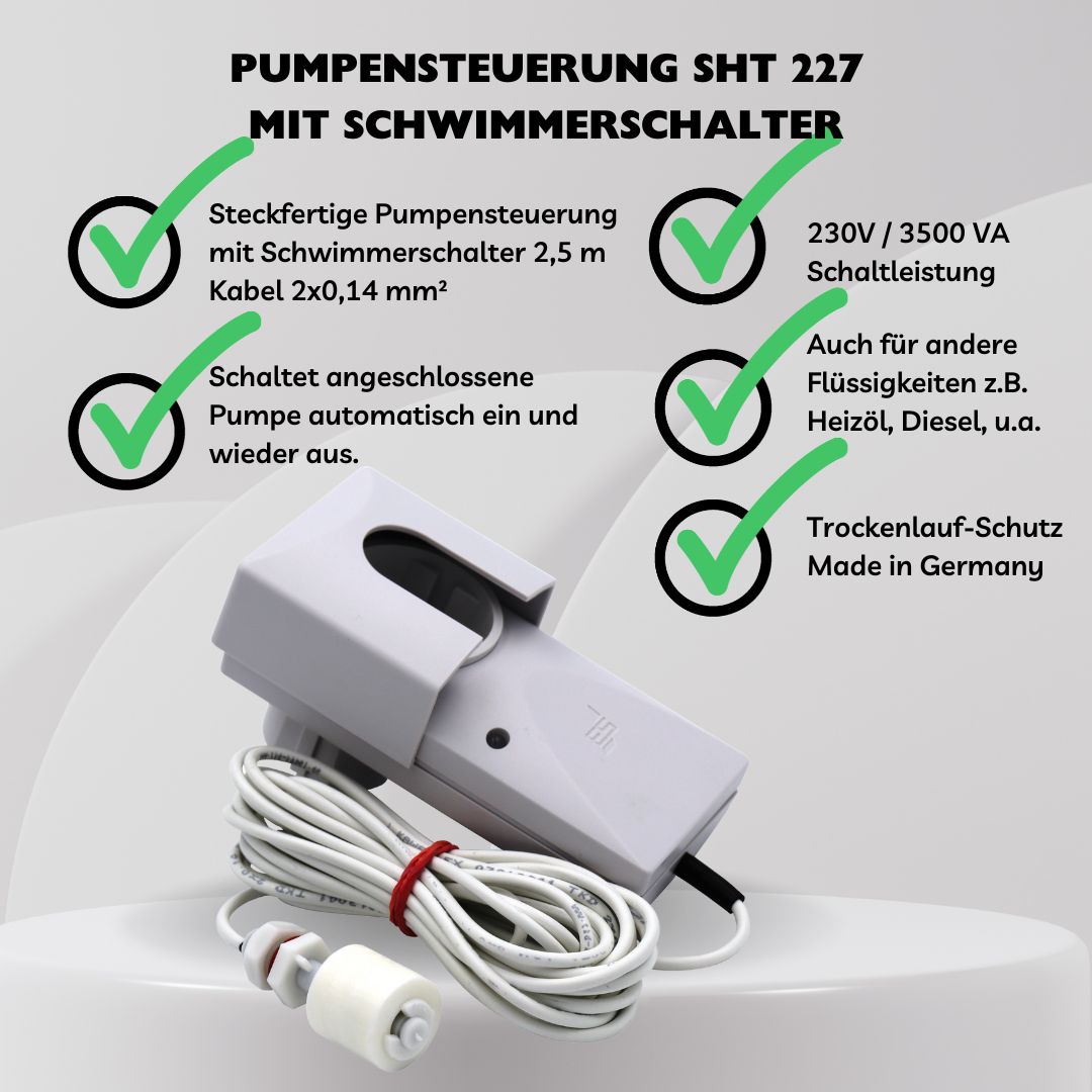 Der Wassermelder SHT 227 ist eine steckfertige Pumpensteuerung, die bei Erreichen einer bestimmten Wasserhöhe eine angeschlossene Wasserpumpe einschaltet und nach Absinken des Wassers und somit des Schwimmers, sowie einer vorgegebenen Zeit auch wieder abschaltet. Über ein stufenloses Einstellrad wird die Nachlaufzeit der Pumpe von 0 bis 100 Sekunden eingestellt. Eine akustische und optische Warnung signalisiert die Wasserstandsänderung.