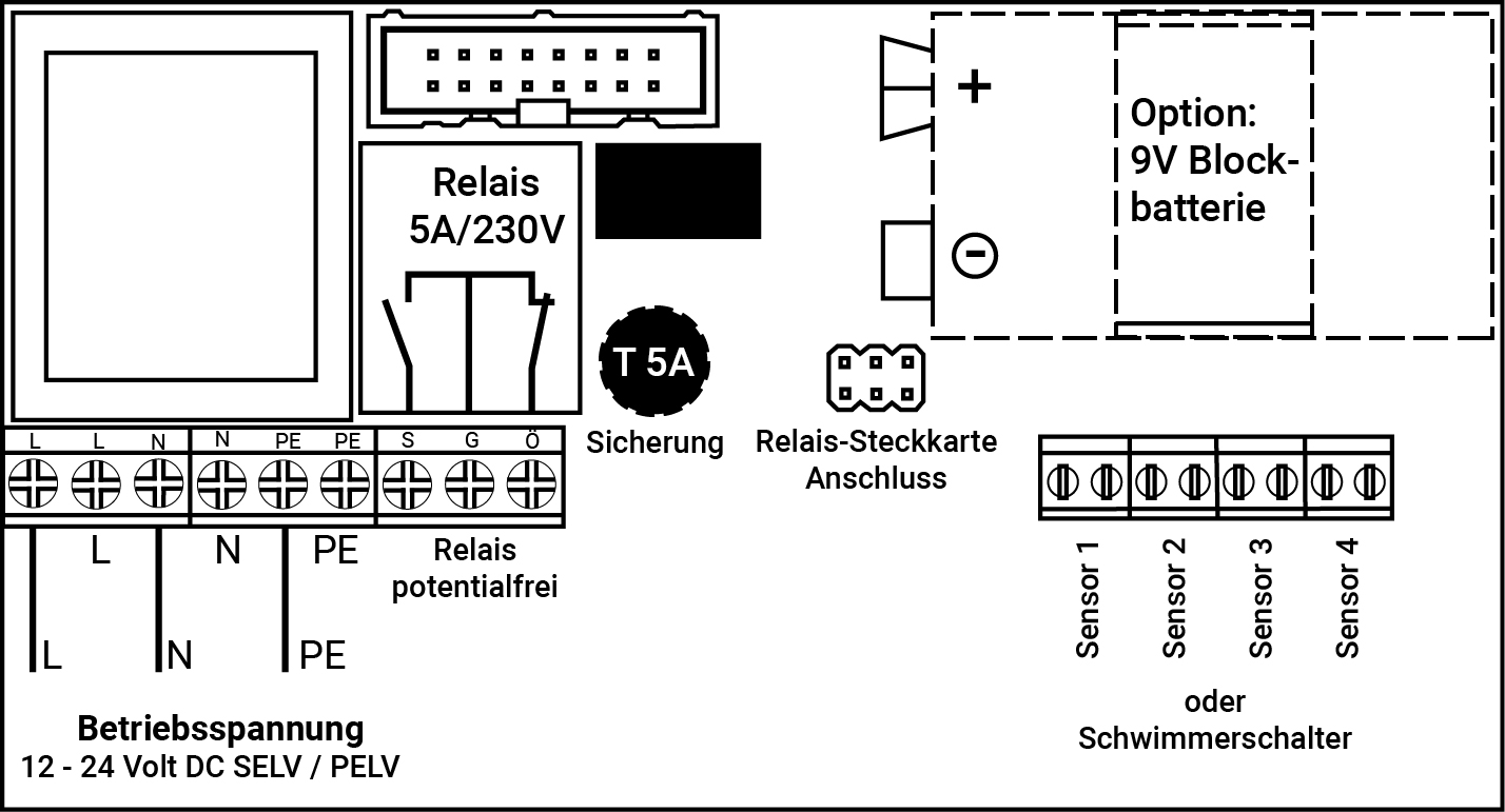 - für Wasserstand bitte Mini-Schwimmerschalter einsetzen. (z.B. in Schächten, Tanks, Pumpensümpfen und ähnliches), Mindestpegelhöhe 4 cm