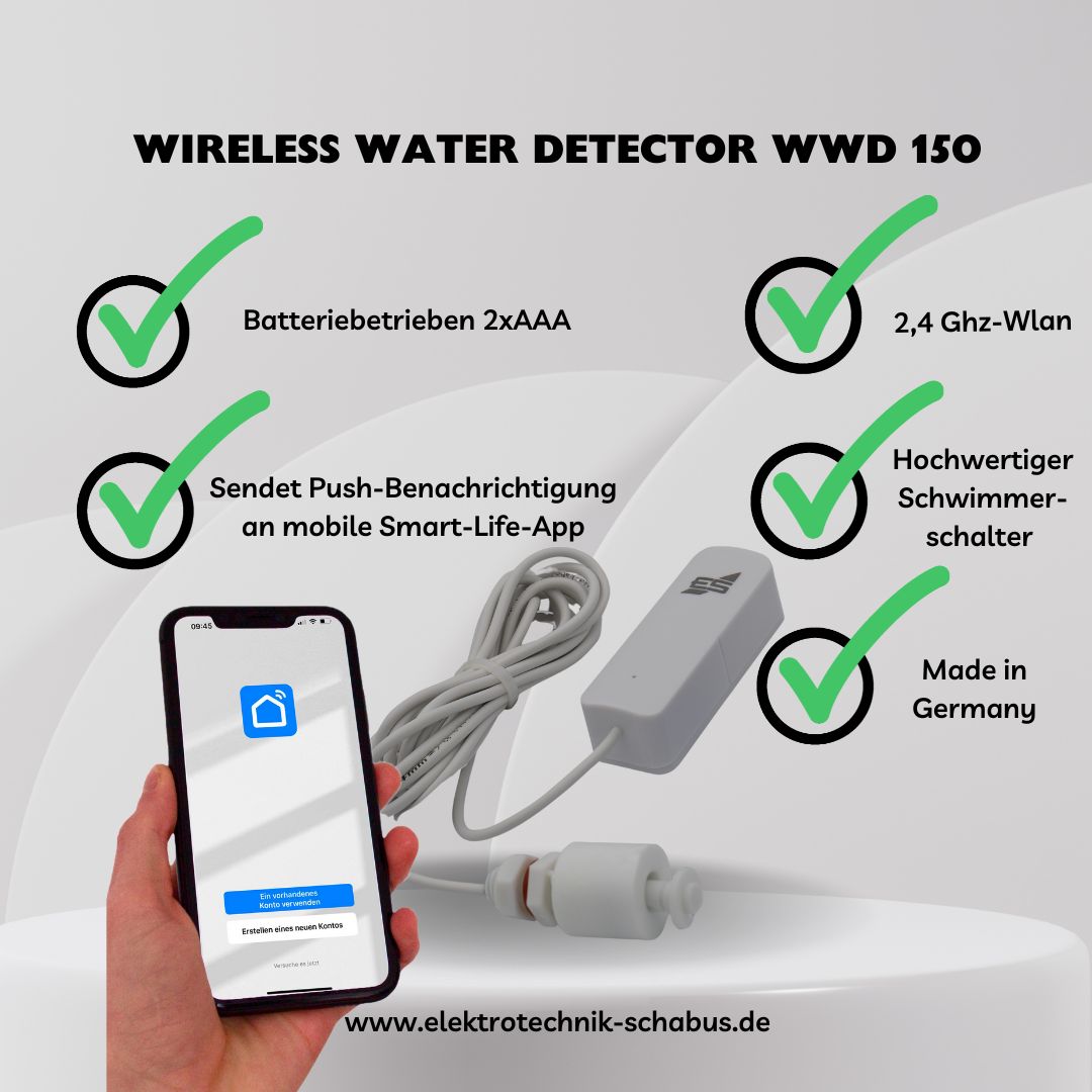 Der WWD 150 Wireless Water Detector ist ein mobiler, batteriebetriebener Wassermelder, der zuverlässig vor steigenden Wasserständen schützt. Ausgestattet mit einem hochwertigen Minischwimmerschalter von SCHABUS, erkennt er Wasserstände ab 4 cm und sendet sofortige Push-Benachrichtigungen an Ihr Smartphone.