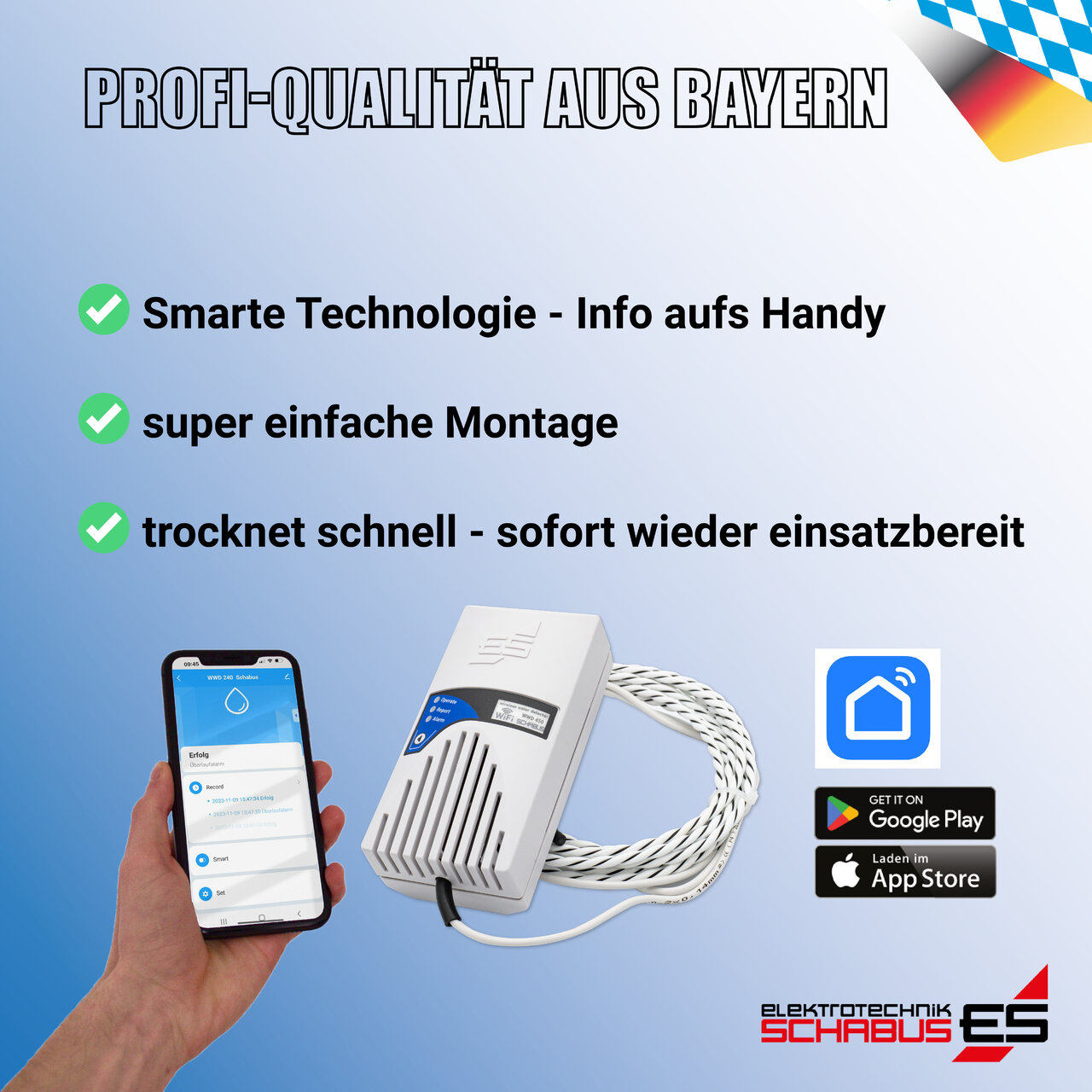 Der Steckdosen-Wassermelder WWD 450 ist die zuverlässige Lösung: Sein Sensorkabel erkennt bereits dünne Wasserfilme oder Pfützen auf dem Boden. Sobald Wasser detektiert wird, löst das Gerät einen lauten akustischen Alarm aus, die LED blinkt rot, und zusätzlich erhalten Sie eine Push-Benachrichtigung auf Ihr Smartphone.